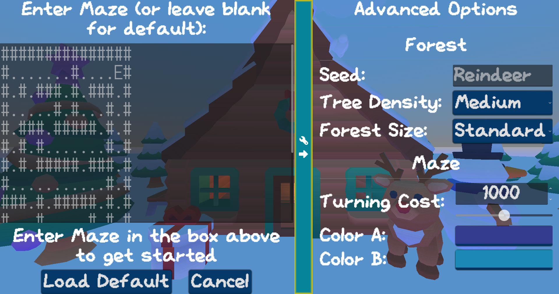 A simple project I made to try out 3D Godot. Load the default maze or create your own and see how the reindeer navigates the maze in real time!